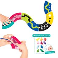 Sezioni di cerchio multicolore con diverse combinazioni colore-texture. Ciascuna sezione è provvista di fori per l''infilaggio delle stringhe incluse e di una texture con superficie ruvida che conferisce feedback sensoriale.Obiettivi didattici:- sviluppo ed esercitazione della motricità fine- stimolo della percezione sensoriale, tattile e visivaContenuto: 36 sezioni di cerchio cm 11 + 10 stringhe in 10 colori + Valigetta