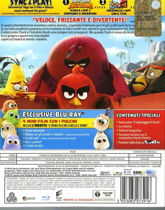 Contenuti:cortometraggio: 4 mini film con i pulcini; scene inedite in lingua originale; speciale: Ballate con gli uccelli e i maialini, imparate la danza del ventre - Uccelli abili, come contruire una torre di maialini - Ecco i pulcini!; altro: Sync & Play: sincronizza l'app con il film e sblocca nuovi contenuti del gioco
