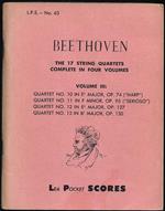 Il pianoforte e la musica da camera. Con le 32 sonate, B. dedicò al pianoforte un monumento poderoso, di alto rilievo nella storia di questo strumento. Spiccano fra le altre l'op. 13 «Patetica», la già citata op. 27 n. 2 «Al chiaro di luna», l'op. 53 «Aurora» o «Waldstein», l'op. 57 «Appassionata». Le ultime 5 sonate (op. 101, 106, 109, 110 e 111) salgono alle altezze metafisiche della Nona Sinfonia e degli ultimi quartetti. Belle, ma spesso convenzionali, le 10 sonate per violino e pianoforte e le 5 per violoncello e pianoforte. Lo stesso si dica degli 8 trii per violino, violoncello e pianoforte, di cui due soltanto raggiungono altezze di stile: l'op. 70 n.?1 «Gli spettri» e l'op. 97 «L'arciduca». Più modesti i quintetti, i trii per archi, i quartetti con pianoforte. Di rilievo ancor maggior che non le 32 sonate pianistiche nel loro insieme sono i 16 quartetti per archi, la cui composizione è scandita in tre fasi nettamente staccate: i 6 dell'op. 18 (1798-1800) appartengono al primo stile; a quello centrale i 3 quartetti op. 59, ricchi di colore quasi romantico ma tradizionali nella forma; gli ultimi cinque (op. 127; op. 130, cui si aggiunge la Grande fuga op. 133; op. 131; op. 132; op. 135), scritti tra il 1822 e il 1826, sono, forse ancor più che la Nona Sinfonia, il punto di massimo avvicinamento all'assoluto e alla suprema altezza dell'arte pura. Nel genere cameristico, meritano menzione due opere tra loro lontane: il leggiadro Settimino in mi bemolle maggiore op. 20 (1800) e le poderose e virtuosistiche 32 Variazioni in do minore per pianoforte (1806).