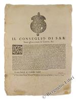 (Manifesto originale del 1669) LA CAMERA DE' CONTI DI S.A.R. Essendo necessario il proueder de' viueri alle Truppe di S.A.R. destinate alla custodia, e Guarniggione delle Piazze, e difesa dello Stato… Dat'in Torino li undeci di Luglio 1669.