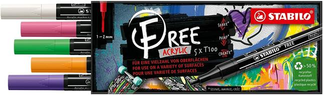 Marker acrilico - STABILO FREE Acrylic - T100 Punta rotonda 1-2mm - Spring Edition - Astuccio da 5 - Colori assortiti